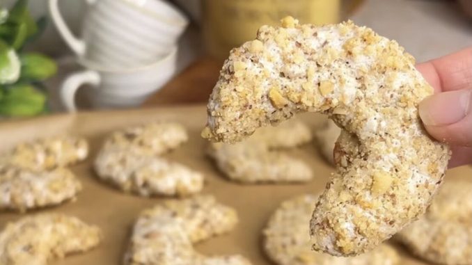 Ovi nježni polumjeseci kolačići pravi su praznični ukras – jednostavni, bez brašna, bez glutena i pripremljeni sa samo tri sastojka.