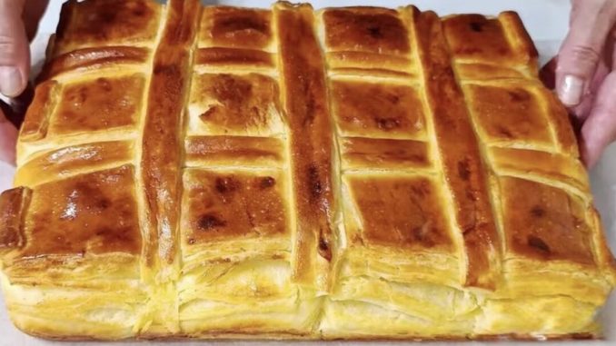 Ova izvrsna lisnata pogača je pravo malo remek-djelo domaće kuhinje. Tako je mekana, nježna i puna tankih slojeva koji se odvajaju jedan po jedan, a svaka kockica se čisto prelomi pod prstima.