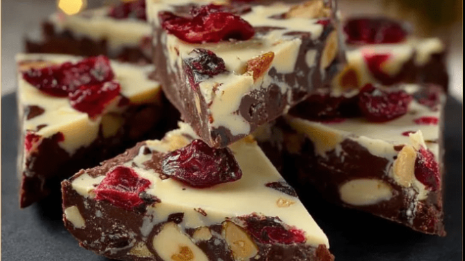 Trokutići od brusnice i čokolade predstavljaju izvrstan užitak koji skladno spaja glatkoću bijele čokolade s dubokim bogatstvom tamne čokolade, nadopunjenim zadovoljavajućom hrskavošću lješnjaka i pikantnom slatkoćom brusnica.