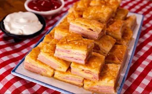 Nakon toga na tijesto poslažite sloj šunke, zatim ploške sira, drugi sloj šunke, a zatim naribani sir. Preko vrha staviti drugi sloj tijesta. Rubove treba stisnuti vilicom, a zatim tijesto izrezati u obliku romba. Razmućeno jaje treba premazati po površini.