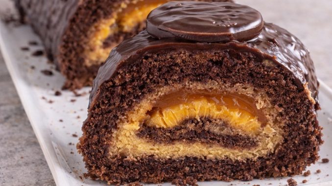 Za koru pripremite: 200 g brašna, 150 g šećera, 2 kašike kakaa, 1 prašak za pecivo, 100 ml ulja i 200 ml vode. U jednoj posudi pomešajte suve sastojke, zatim dodajte ulje i vodu i sve dobro izmešajte dok ne dobijete glatku smesu. Sipajte u pleh obložen papirom za pečenje i pecite na 180°C oko 20–25 minuta. Kada se ohladi, koru možete blago preseći ili ostaviti celu za rolat kao na slici.