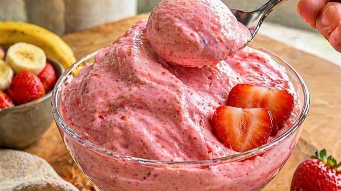 Za ovaj brzi domaći sladoled potrebni su samo osnovni sastojci: 2 zrele banane, 200 g zamrznutih jagoda, 200 ml slatke pavlake i 2 kašike meda ili šećera u prahu (po ukusu).